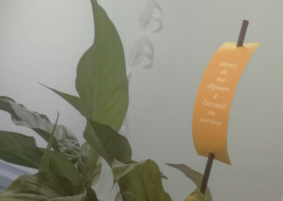 interventions éphémères aux blanc d’Espagne sur les vitres de la résidence.